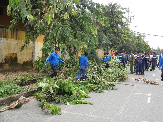 Đoàn viên thực hiện cắt cỏ dại và mé nhánh cây trong